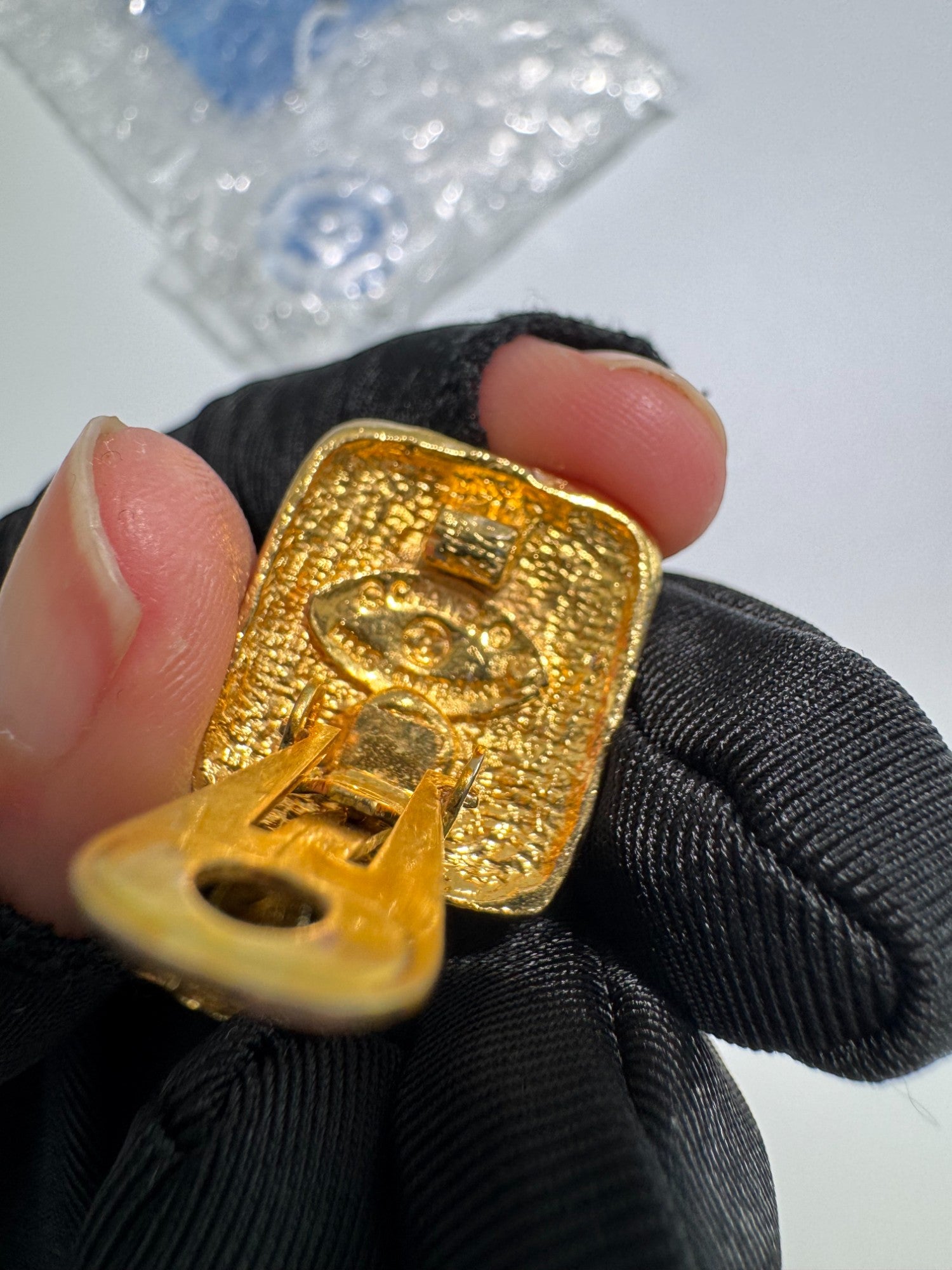 These chic Chanel earrings feature the iconic interlocking CC logo embellished with sparkling clear crystals, set on a textured black leather square framed in gold-tone metal. The bold yet elegant design captures the timeless sophistication of Chanel, making them a versatile statement piece for both casual and dressy looks.