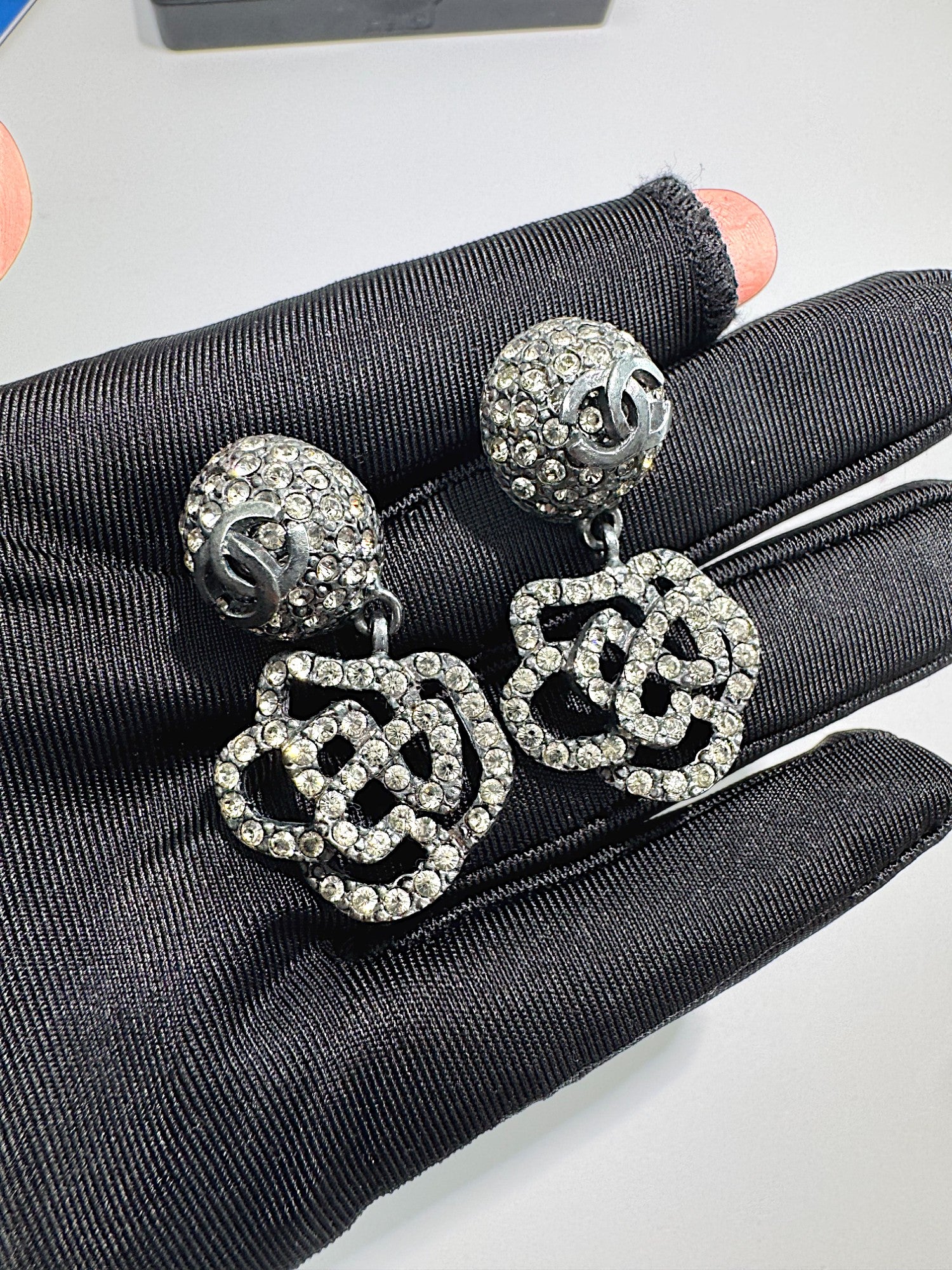 These glamorous Chanel earrings feature a round crystal-encrusted stud with the signature CC logo, finished with dangling camellia flower drops fully set in sparkling clear crystals. Crafted in dark silver-tone metal, the design beautifully combines Chanel’s iconic symbols with a bold, statement-making style. Perfect for elevating both day and evening looks.