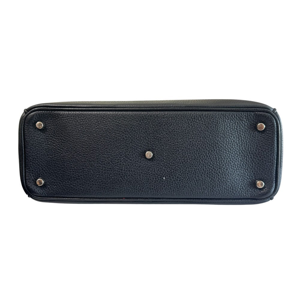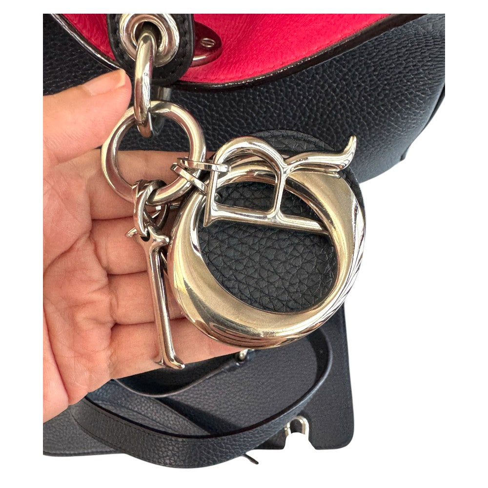 This Dior Diorever tote is crafted from luxurious black grained leather with contrasting red interior lining, combining modern elegance with a structured silhouette. It features the signature silver-tone “D.I.O.R.” charm and polished hardware. Designed with top handles and a detachable shoulder strap, the bag offers versatile carrying options, perfect for both professional and casual looks.