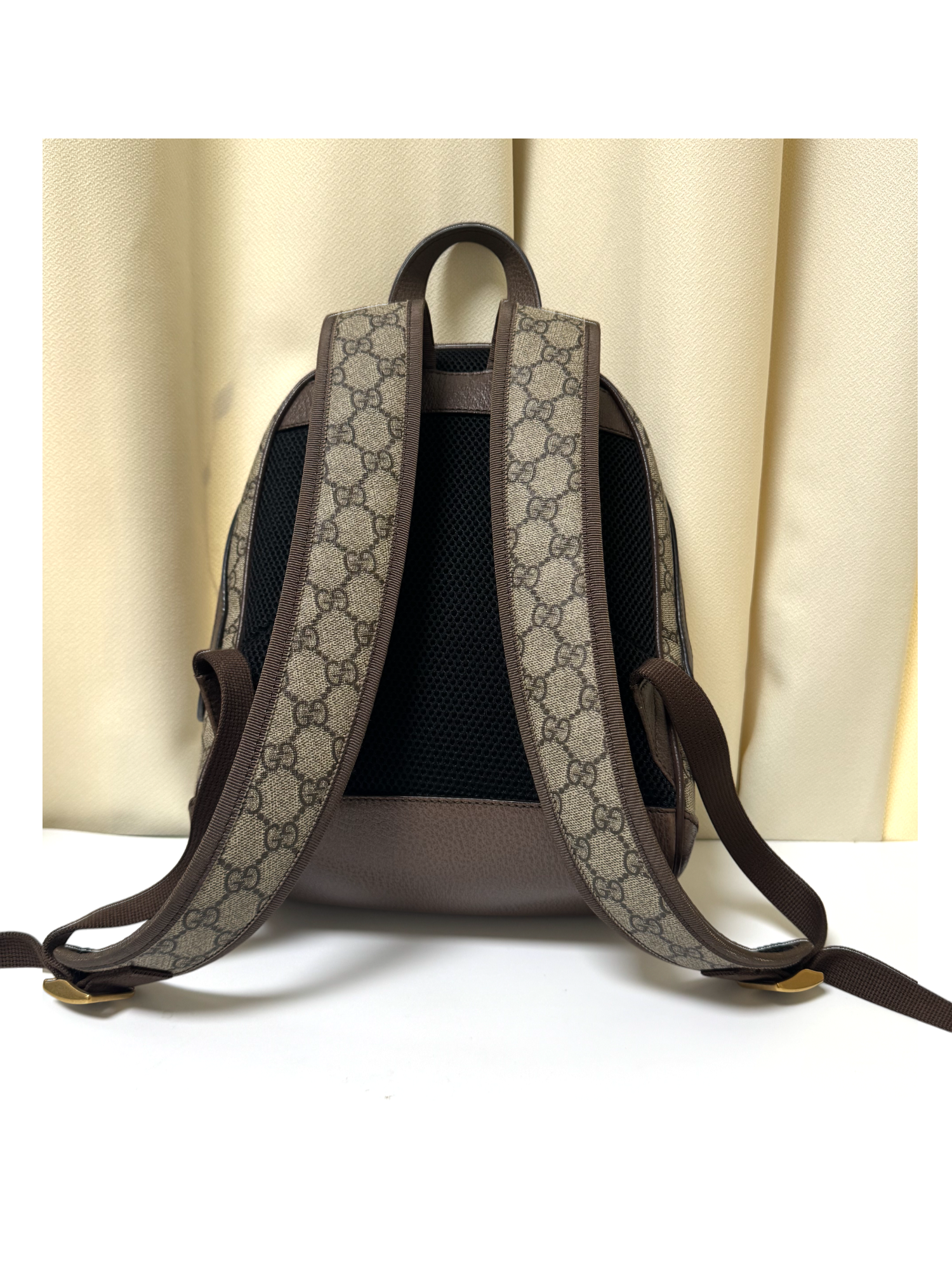 This authentic pre-owned Gucci backpack is crafted from signature GG Supreme canvas with brown leather trim. It features the iconic green and red Web stripe at the center, gold-tone GG logo hardware, and adjustable shoulder straps for comfortable wear. The front zip pocket and spacious main compartment provide practical storage for everyday essentials.