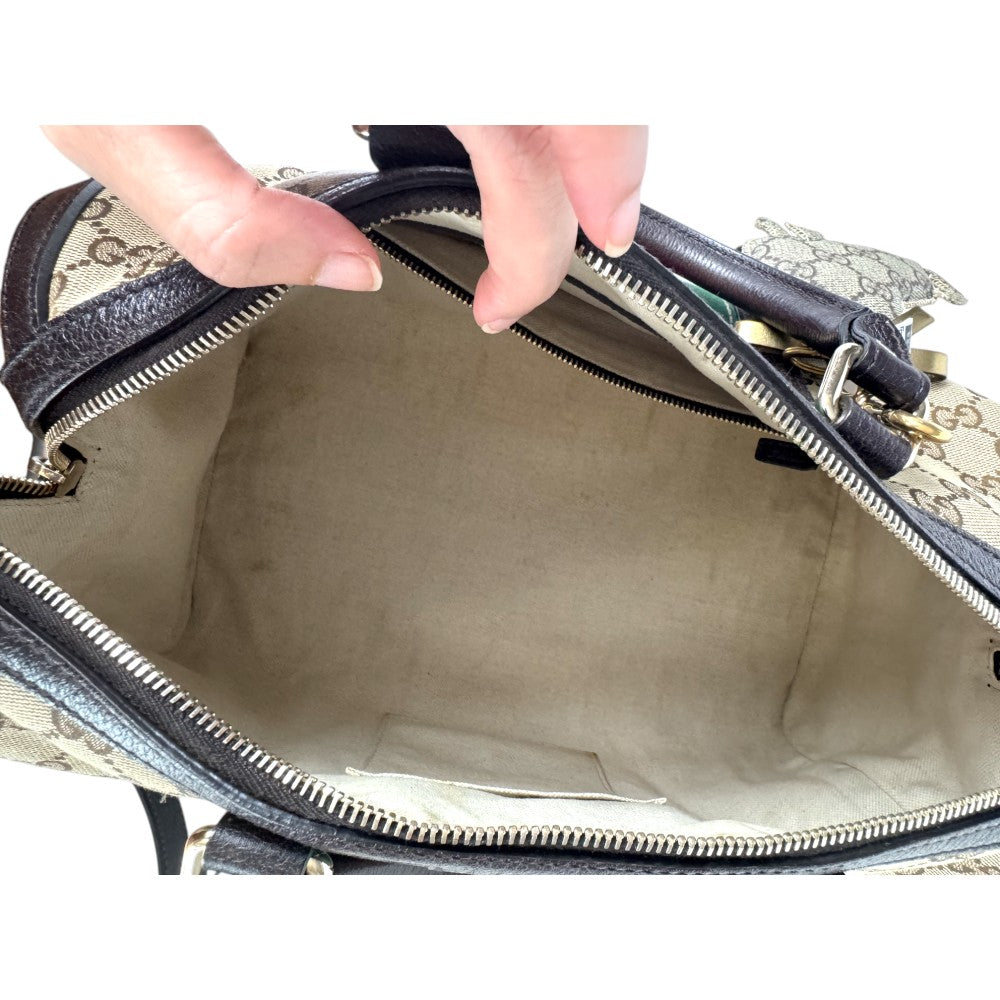 This Gucci Ophidia Boston bag is crafted from GG Supreme canvas with brown leather trim, featuring the signature green and red Web stripe down the center. Designed with double top handles and a detachable shoulder strap, it offers versatile carry options for everyday use. The spacious interior makes it a practical yet stylish choice. The bag is accented with gold-tone hardware and includes a playful dog keychain charm for a unique touch.
